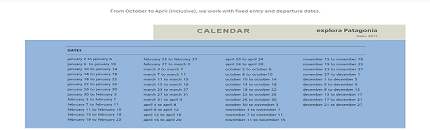 - When to visit: Patagonia is unique with every passing season, which is why we are open year round. The Patagonian weather is unpredictable; within the same day you can experience snow, heat, rain and wind. From October to April (inclusive), we have fixed entry and departure dates. Please check our calendar
